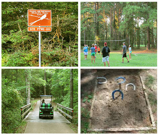 Activities Want to know where to eat, places to go and things to do during your stay? Then go to Nacogdoches Convention Visitors Bureau; here you will find out everything you need to know about Nacogdoches, the oldest town in Texas! Onsite Activities Include: Miles of nature trails Jogging Hiking Golf carting (for an additional fee) Soccer Basketball Volleyball Horseshoes Bonfires Scavenger hunts Bird watching Creek wading Click here to see a map of the Stag Leap property. Nearby attractions & activities include: Antique shopping Numerous museums and historical landmarks Fishing, boating & disc golf at Lake Nacogdoches and Lake Naconiche Stephen F. Austin State University Ruby Mize Azalea Garden and Arboretum Stephen F. Austin Observatory Woodland Hills Golf Course Ellen Trout Zoo Splash Kingdom Waterpark Monthly flea markets Texas Forestry Museum Events in Nacogdoches Live music and theater opportunities